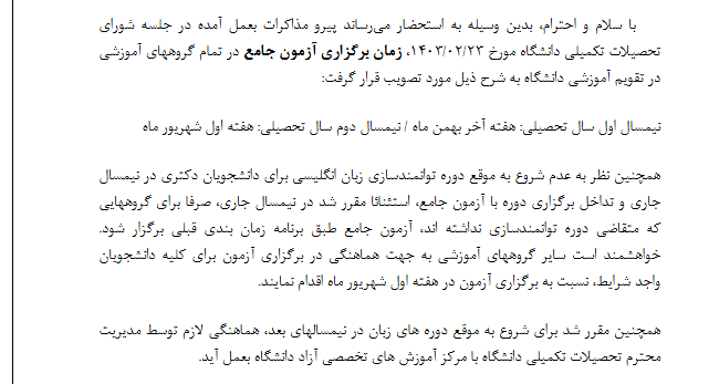 زمان برگزاری آزمون جامع (تاریخ دقیق برگزاری آزمون جامع در هر نیمسال توسط مدیر محترم تحصیلات تکمیلی دانشکده اعلام می گردد.)