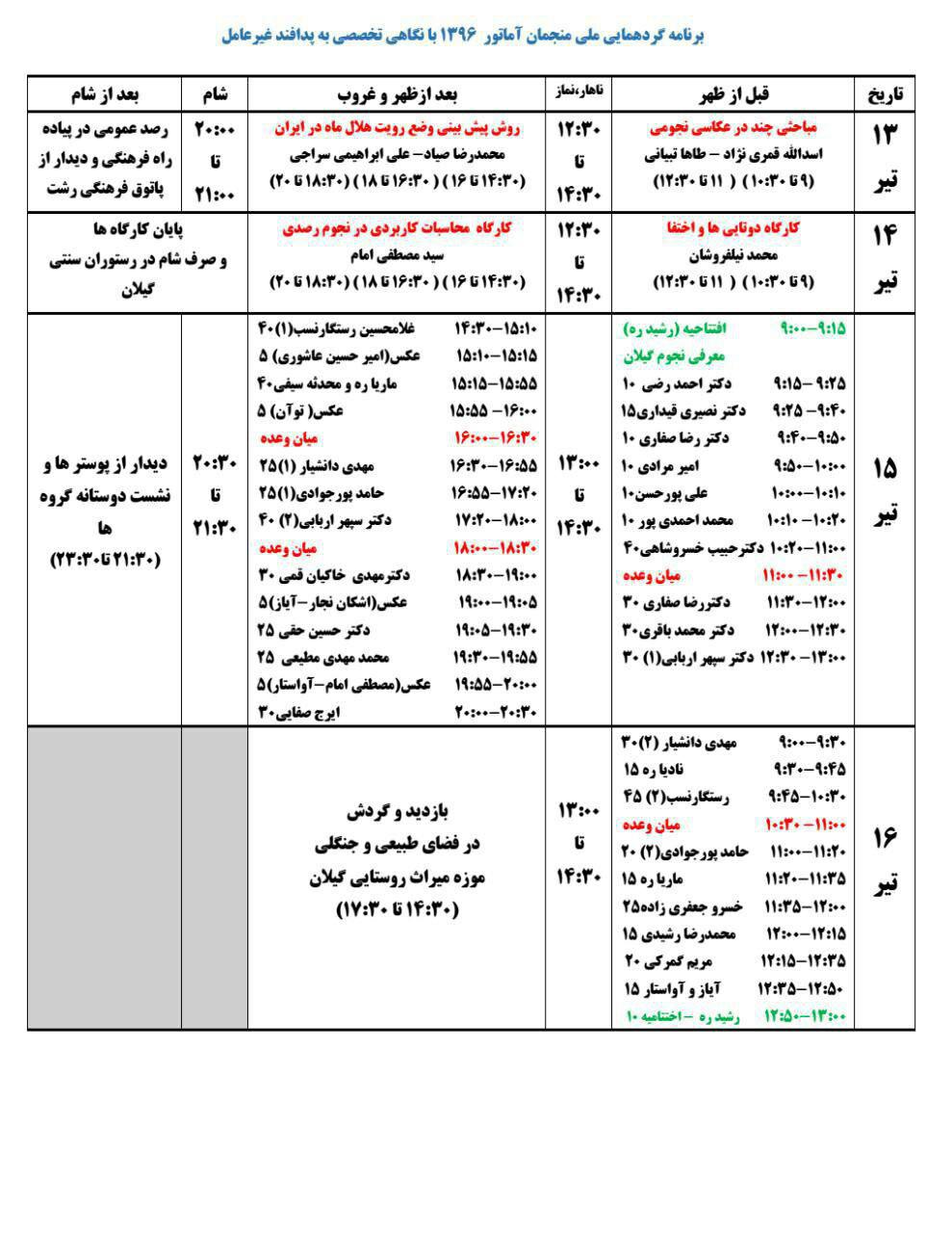 "گردهمایی ملی منجمان آماتور در سال 1396 با نگاه تخصصی به پدافند غیرعامل" با همکاری دانشگاه گیلان از تاریخ 13 الی 16 تیرماه در استان گیلان برگزار می شود. به اطلاع کلیه دانشجویان  و دانش آموزان استان گیلان می رساند، امتیاز برگزاری برنامه امسال طی ۴ روز از طرف انجمن نجوم ایران به جامعه نجوم گیلان واگذار شده و برنامه مذکور با یاری دانشگاه گیلان، پدافند غیرعامل استان و شهرداری رشت برگزار خواهد شد. لذا این امکان حاصل شده تا دانشجویان و اعضای هیات علمی علاقه مند کلیه رشته های دانشگاه گیلان (به صورت رایگان و با تقبل هزینه های مرتبط از سوی دانشگاه) در هر ۴ روز برنامه مذکور حضور داشته باشند و از سخنرانی دانشمندان و فرهیختگان نجوم کشور، بهره ی لازم حاضر را ببرند. گردهمایی امسال با رونمایی از عنوانی جدید از نجوم، "ارتباط نجوم با پدافند غیرعامل" همراه خواهد بود که شامل موارد ذیل است: - برخورد شهاب سنگها - اشعه های خورشیدی -تاثیرات ماه و خورشید بر زمین - ماهواره ها - آلودگی های نوری و صوتی - مواد مصرفی در پایگاه های فضایی - پزشکی فضایی و نجومی - تغییرات در اقلیم زمین - حرکت هواپیماها و فضا پیماها - رویت هلال ماه - جو زمین - زباله های فضایی - تجهیزات الکترونیکی (navigation) - هواشناسی - مخابرات و اینترنت - دسترسی به خاک سایر سیارات - عکاسی نجومی و مشاهدات عجیب - نجوم کروی و موارد دیگر که تا کنون مورد توجه همه کشورهای توسعه یافته بوده و می باشد. از فرهیختگان نجوم کشور، اساتید، دانشجویان و دانش آموزان دعوت به عمل می آید تا ضمن شرکت در برنامه ی فوق در ارائه بهترین تعاریف در راستای ارتقا امنیت و صلح بشریت با پدافند غیرعامل کشور همراهی نمایند. همچنین پس از گذراندن دوره ۴ روزه، به هر شرکت کننده دو مدرک ملی اعطا خواهد شد؛ یکی مخصوص دو روز اول گردهمایی که ویژه ۴ کارگاه تخصصی است و دیگری به جهت حضور در سمینار دو روزه به همراه دانشمندان نجوم کشور. مراسم اختتامییه: ساعت 9 صبح سالن اجتماعات پارک علم و فناوری علاقه مندان می توانند با کلیک بر روی تصاویر زیر اطلاعات تکمیلی در این خصوص را کسب کنند. ریز برنامه های گردهم آیی:
